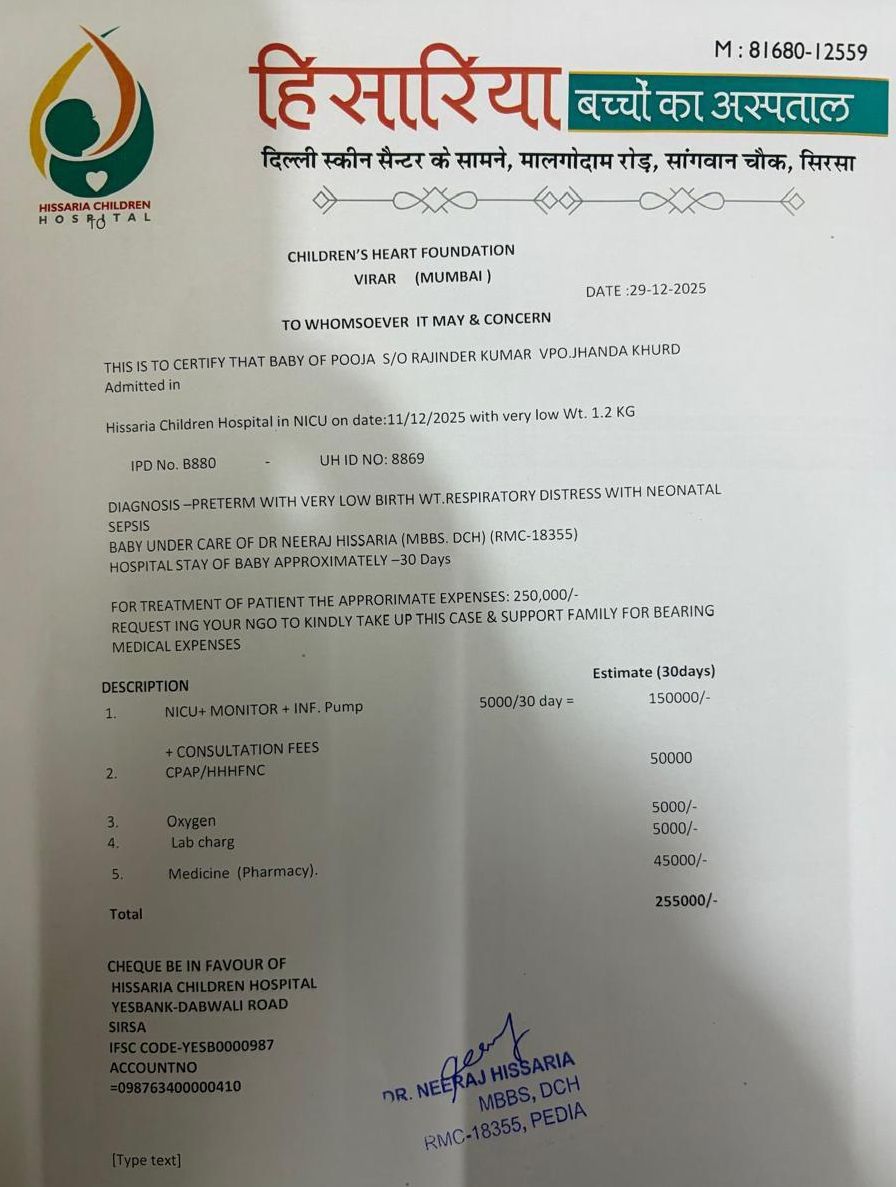 This is to certify that Baby of Pooja S/O Rajinder Kumar VPO. Jhanda Khurd admitted in Hissaria children hospital in NICU on date: 11/12/2025 with very low wt. 1.2 kg.