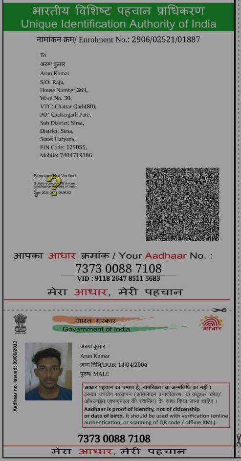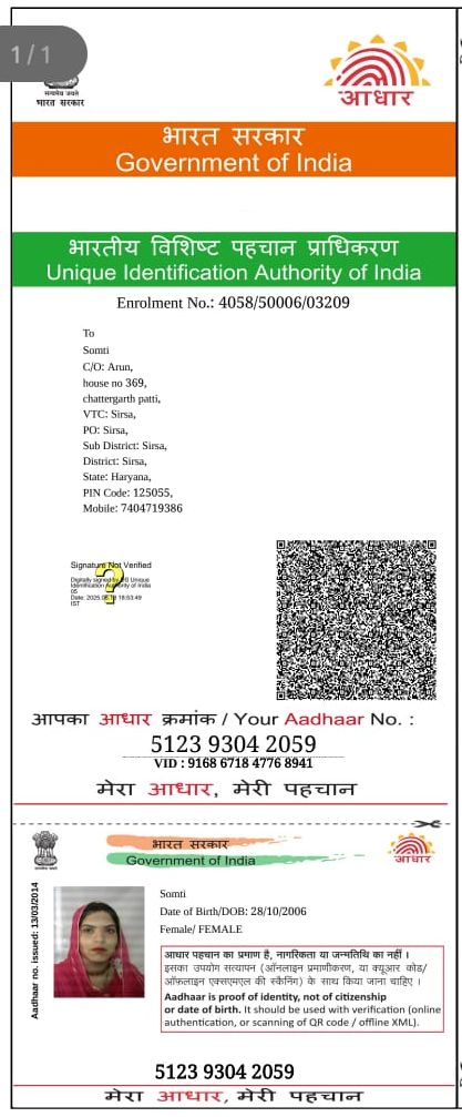 This is to certify that Baby of Somti son of Arun Kumar. Sirsa Haryana admitted in Hissaria Children Hospital in NICU on date: 05/11/2025 with Very Low Wt. 950 gm.