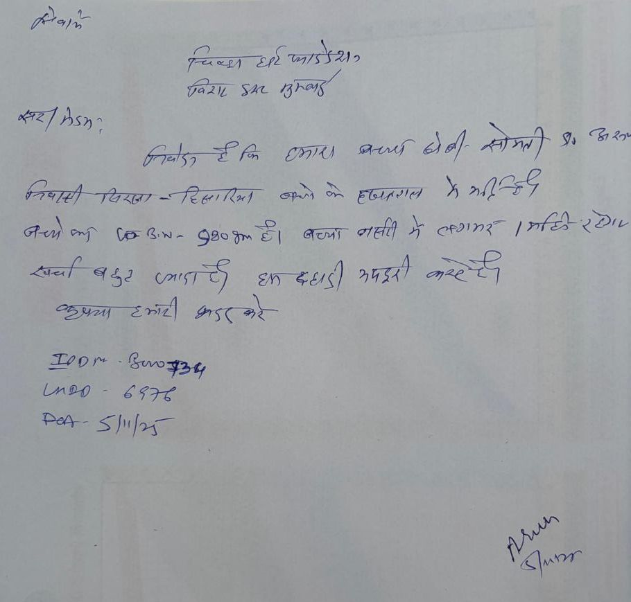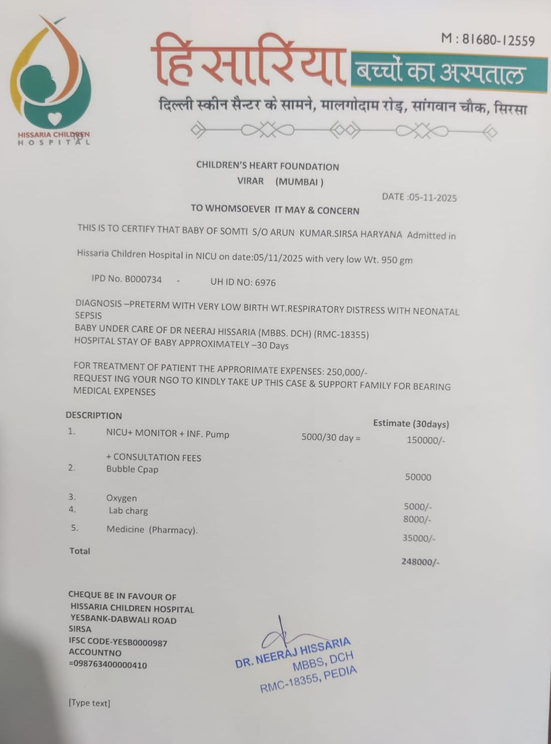 Diagnosis-preterm with very low birth with Respiratory distress with neonatal Sepsis. Baby under care of Dr Neeraj Hissaria (MBBS. DCH) (RMC-18355) hospital stay of baby approximately – 30 days. For treatment of patient the approximate expenses: 250,000/-
