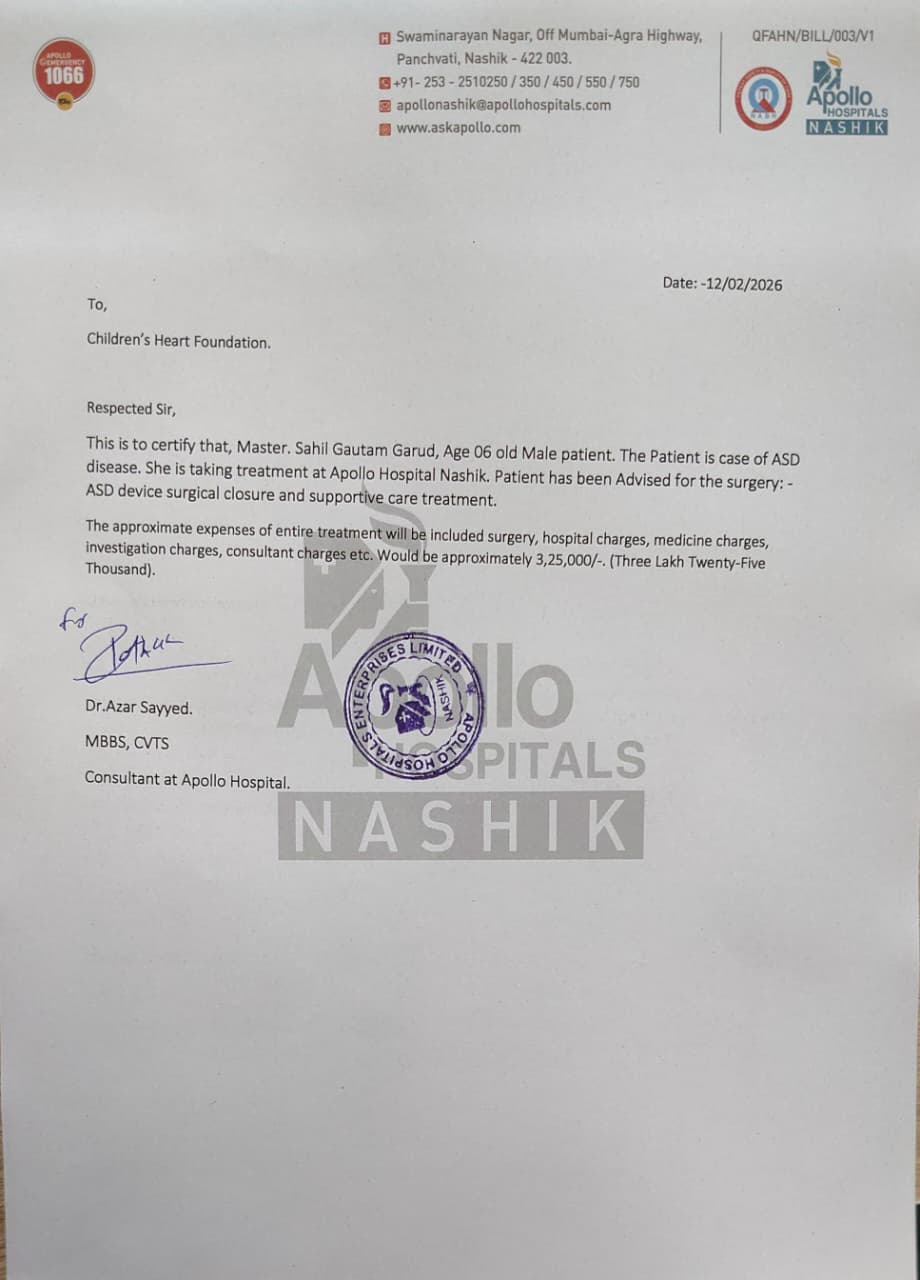 This is to certify that, Master. Sahil Gautam Garud, Age 06 old Male patient. The Patient is case of ASD disease. She is taking treatment at Apollo Hospital Nashik. Patient has been Advised for the surgery: – ASD device surgical closure and supportive care treatment.