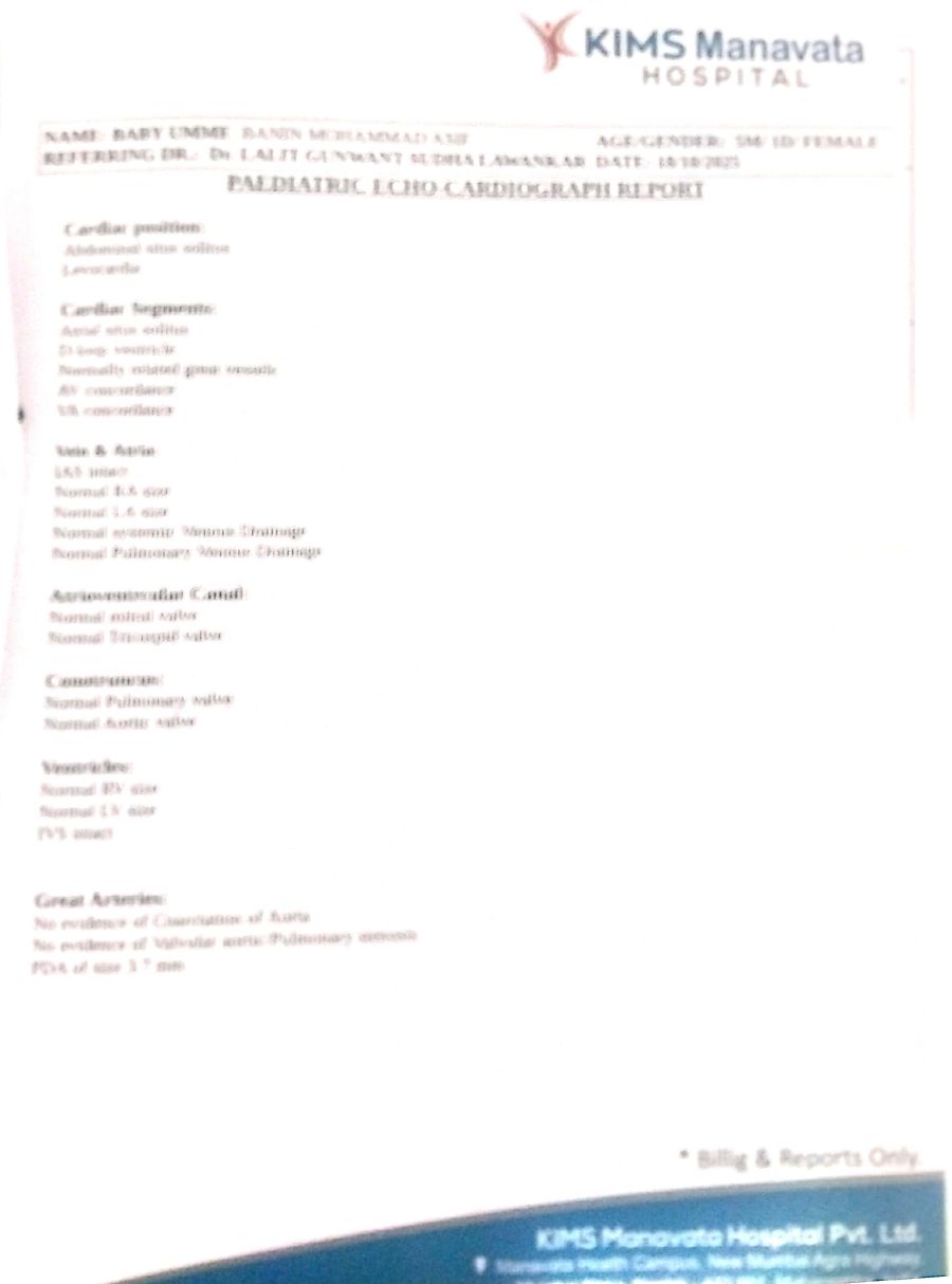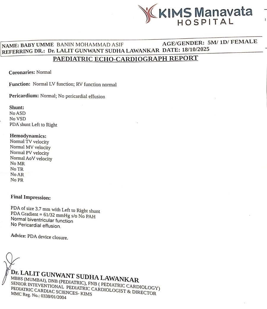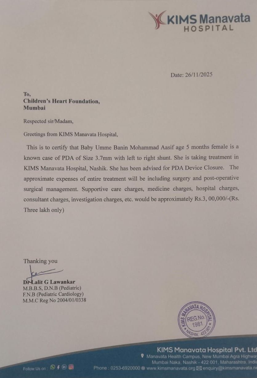 This is to certify that Baby Umme Banin Mohammad Aasif age 5 months female is a known case of PDA of Size 3.7mm with left to right shunt. She is taking treatment in KIMS Manavata Hospital, Nashik. She has been advised for PDA Device Closure.