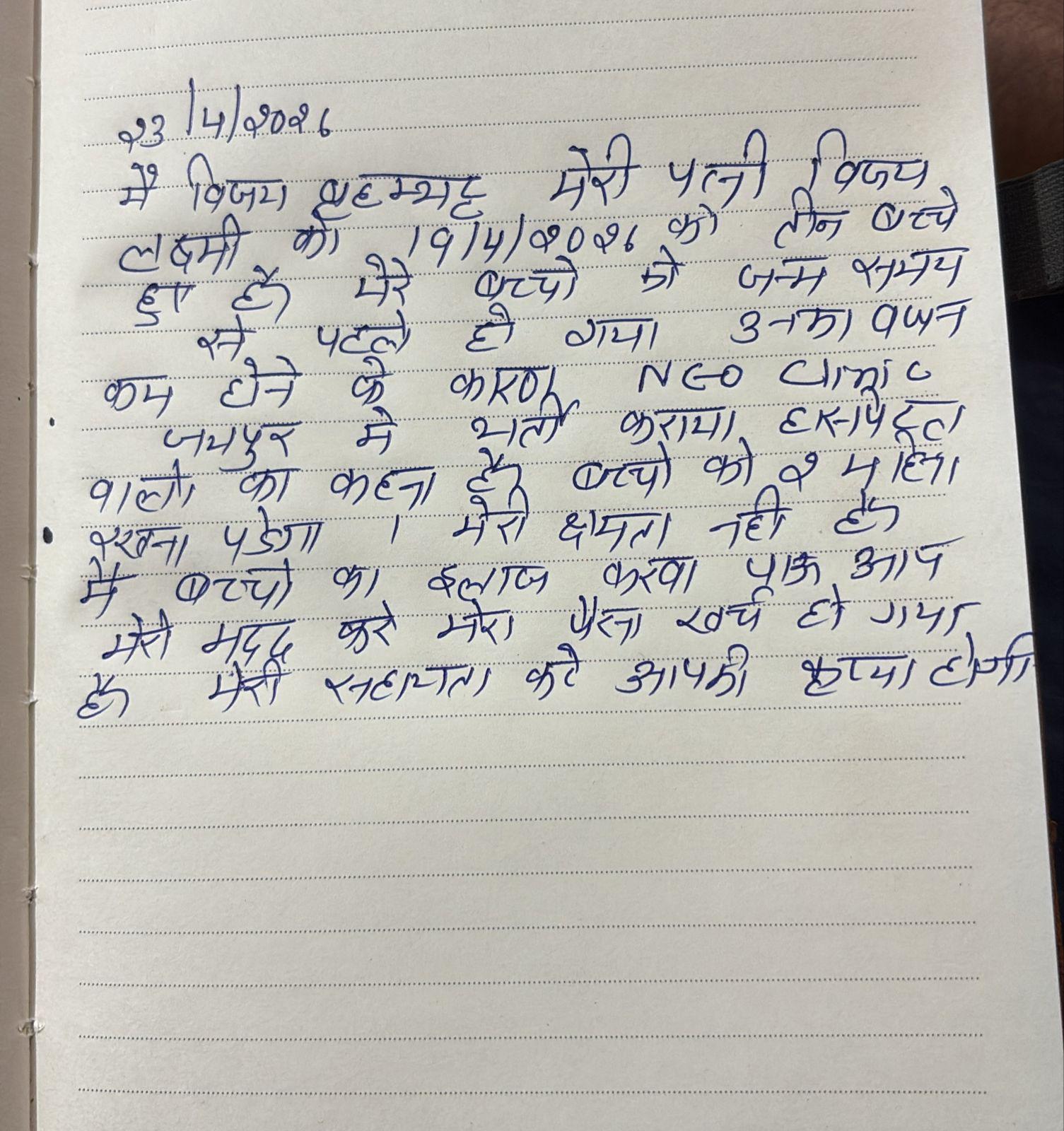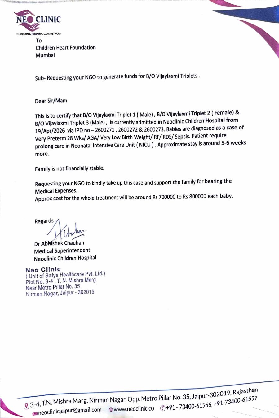 This is to certify that B/O Vijaylaxmi Triplet 1 (Male), B/O Vijaylaxmi Triplet 2 (Female) & B/O Vijaylaxmi Triplet 3 (Male), is currently admitted in Neoclinic Children Hospital from 19/Apr/2026 via IPD no-2600271, 2600272 & 2600273. Babies are diagnosed as a case of Very Preterm 28 Wks/ AGA/ Very Low Birth Weight/ RF/RDS/ Sepsis. Patient require prolong care in Neonatal Intensive Care Unit (NICU). Approximate stay is around 5-6 weeks more.